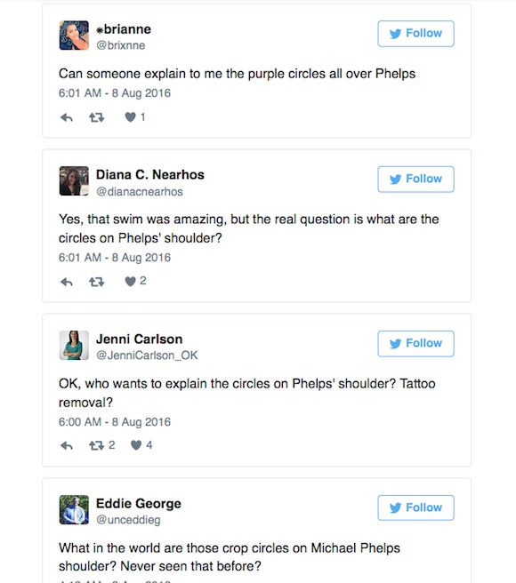 Какви са тези странни петна по раменете на Майкъл Фелпс?, питаха се бдителни зрители след мъжката щафетата 4х100 метра свободен стил на Олимпийските игри в Рио. Най-титулуваният олимпиец за всички времена спечели своята рекордна 19-а олимпийска титла, след като заедно със съотборниците си от квартета на САЩ постигна време 3:09.92 минути.