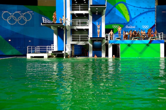 От Международната федерация по плувни спортове констатираха, че проблемът е заради липсата на достатъчно химикали в системата, което е променило pH нивата и е предизвикало промяна в цвета на водата.