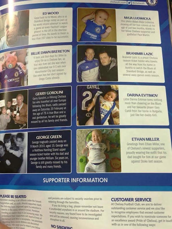 Благодарение на шефа на официалния фенклуб на Челси за България Димитър Попов Евтимов се сдоби толкова бързо със скъпоценната програма от двубоя, в която българското бебе доволно се усмихва. Следващата идея на Митко Попов и Кирил Евтимов е в най-скоро време да успеят да поставят на "Стамфорд Бридж" и официален флаг на нашенския фенклуб, такъв какъвто там имат доста от фенклубовете на "сините" по света.