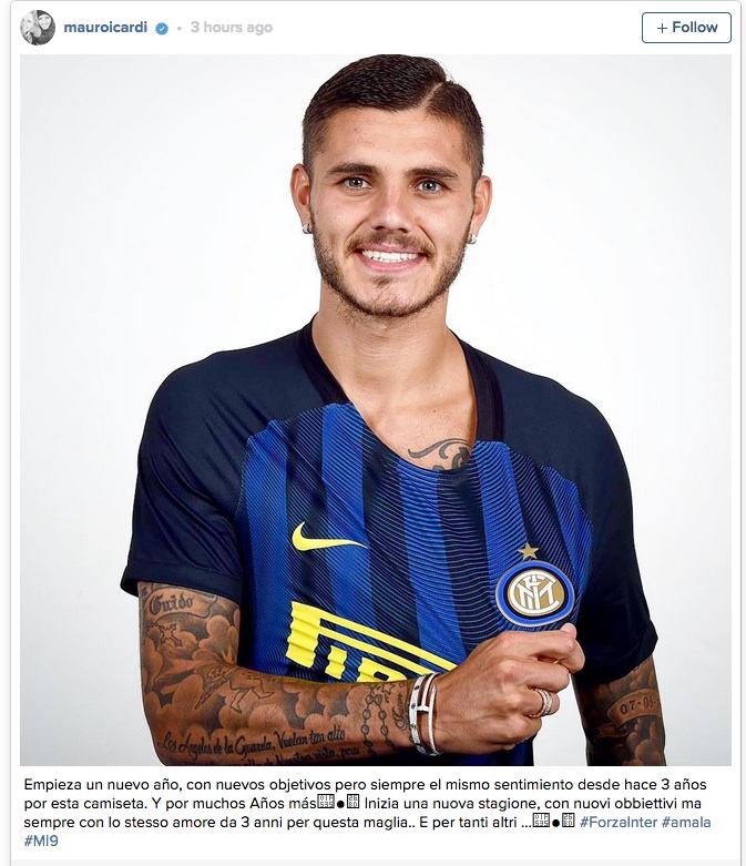 "Започна една нова година с нови цели, но от три сезона съм все така привързан към тази фланелка и ще бъде така още дълги години. Започва нов сезон с ясни цели", написа Икарди в своя профил в Туитър, като публикува своя снимка с екипа на "черно-сините".