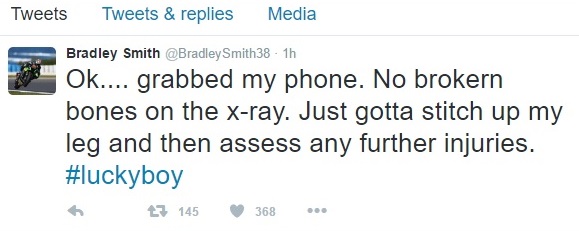 Смит остана в съзнание, но със силни болки и външни рани и бе откаран веднага в болница. За щастие, той избегна счупване на бедрената кост по чудо, както и сериозни травми на коляното си. Нужни бяха няколко шева, но пилотът ще продължи престоя си в болницата.