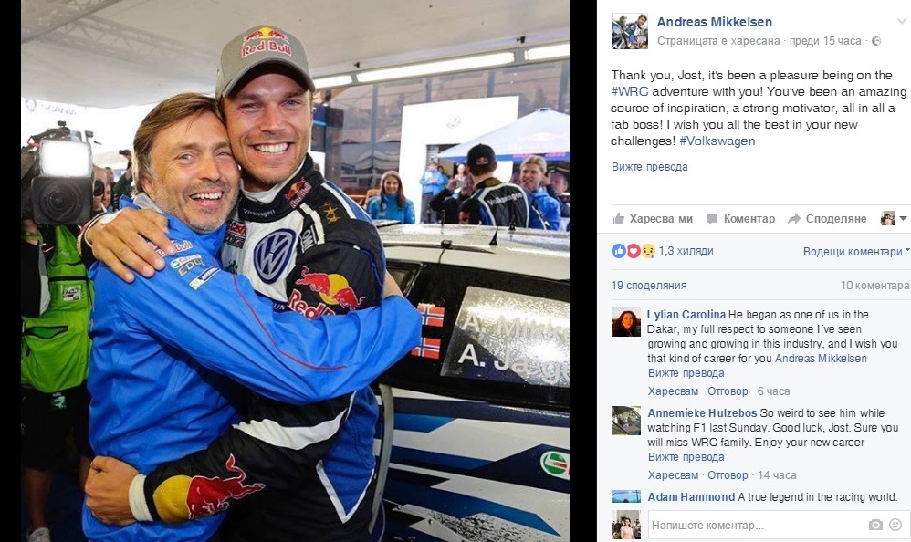 Късно снощи Микелсен написа в профила си във Facebook: "Благодаря ти, Йос! Бе удоволствие да бъда част от приключението на WRC с теб! Ти беше невероятен източник на вдъхновение, силен мотиватор и чудесен шеф! Желая ти всичко най-хубаво по време на новото ти предизвикателство!".