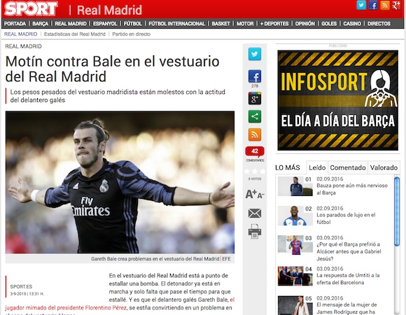 В съблекалнята на Реал Мадрид има недоволство от поведението на Гарет Бейл в последно време, твърди излизащият в Барселона вестник Sport. Според информацията неговите съотборници били ядосани от факта, че уелският национал настоявал за значително увеличение на заплатата си - до 17 млн. евро на сезон. За да убеди боса Флорентино Перес, Бейл използвал добрите си игри през изминалите месеци. Останалите играчи в бяло обаче били на мнение, че като цяло офанзивният футболист не заслужавал увеличение, защото преди това далеч не бил на същото високо ниво на терена, а сега просто използвал моментния подем в представянето си.