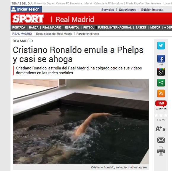 Излизащият в Барселона вестник Sport отново намери начин да иронизира случващото се в лагера на големия съперник Реал Мадрид. Изданието, което явно подкрепя отбора на Лионел Меси, този път се заяжда с Кристиано Роналдо. "Кристиано се прави на Фелпс и за малко да се удави", гласи заглавието на материал в онлайн изданието на Sport.