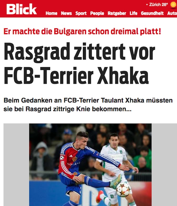 В навечерието на сблъсъка в Шампионската лига в Швейцария смятат, че в отбора на Базел има един специален футболист, от когото в Лудогорец направо треперят. "При мисълта за териера на Базел Таулант Джака в Разград им омекват колената", твърди местният вестник "Blick".