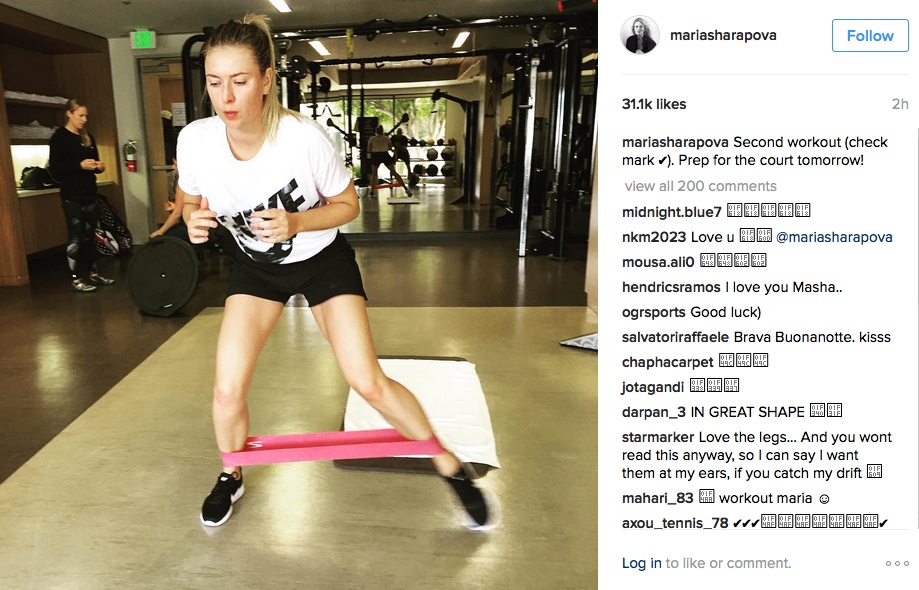 Руската тенисистка Мария Шарапова продължава със здравите тренировки във фитнеса, въпреки наказанието, което получи за употреба на забранения стимулант мелдоний след Откритото първенство на Австралия. Тя публикува своя снимка в Инстаграм как изпълнява поредното упражнение, като написа: "Втората тренировка за деня (изпълнена). Следва подготовка за явяването ми в съда утре!"