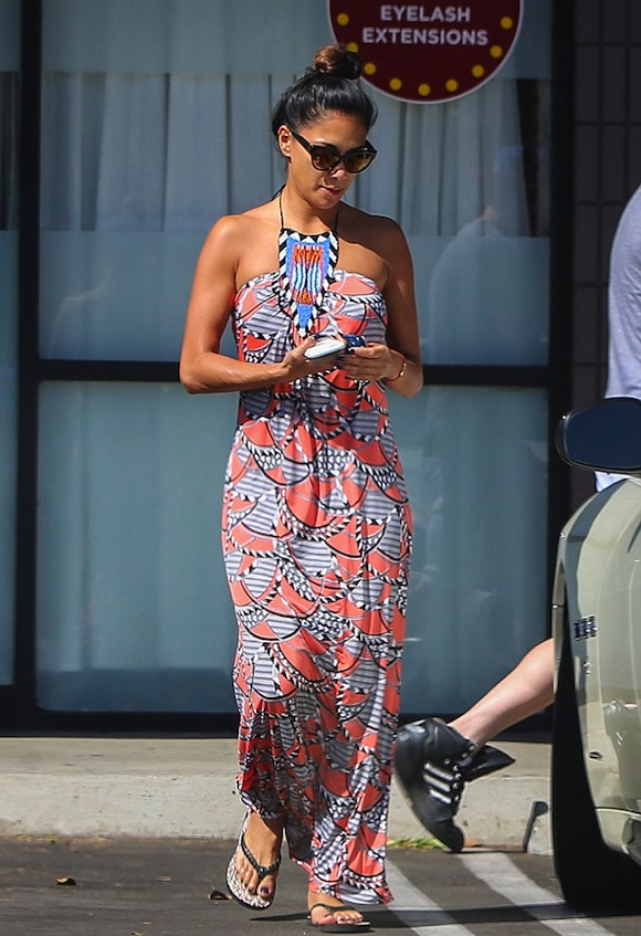 38-годишната Никол се разходи из Ел Ей в цветна лятна рокля, плътно прилепнала по тялото и подчертаваща съблазнителните й извивки. В унисон с отпускарската визия, тя бе съчетала дрехата с джапанки. Аксесоарите пък бяха сведени до минимум, а косата й небрежно вързана на висок кок.