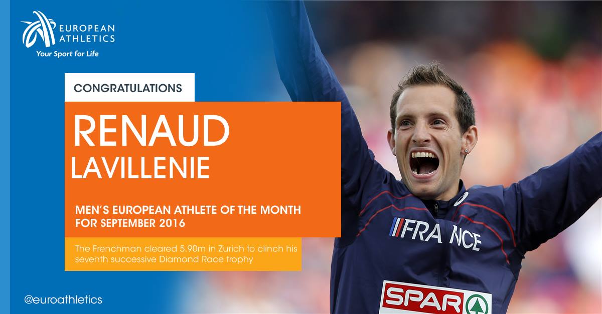 Световният рекордьор в овчарския скок Рено Лавийени и европейската шампионка в скока на дължина Ивана Шпанович бяха избрани за най-добри атлети в Европа за месец септември. Французинът и сръбкинята заслужиха най-много гласове в страниците на Европейската атлетика във Фейсбук и Туитър. Лавийени завърши сезона със седми пореден диамантен трофей в Диамантената лига, след като триумфира и на финала в Цюрих. Шпанович също приключи лятото по впечатляващ начин - национален рекорд на Сърбия от 7.10 м пред родна публика в Белград.