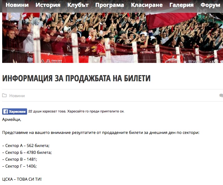 Ръководството на ЦСКА-София обяви, че за мача с Левски са продадени 8229 билета. Както е известно, секторите "А" и "Г" са предназначени за червените фенове, а "Б" и "В" - за сините запалянковци. Според справката, предоставена от официалния сайт на ЦСКА-София, днес привържениците на отбора са закупили точно 1968 билета. Феновете на Левски пък са се сдобили с 6261 билета. От публикацията не става ясно обаче дали сините запалянковци вече са закупили въпросните 6261 билета, или толкова са предоставени на клуба от "Герена", който тепърва ще ги продава.