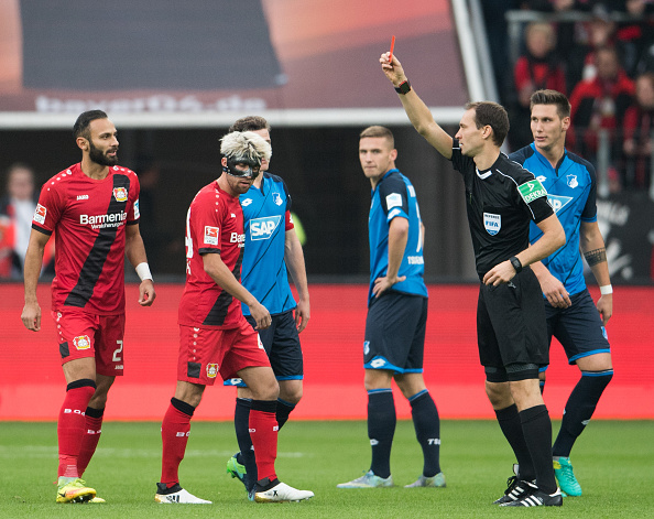 Още в 6-ата минута "аспирините" от Леверкузен останаха с 10 души на терена. Червен картон получи нападателят Кевин Фоланд. Той извърши нарушение като последен в отбрана срещу Керем Демирбай и реферът Бастиан Данкерт показа на бившия играч на Хофенхайм пътя към съблекалните.