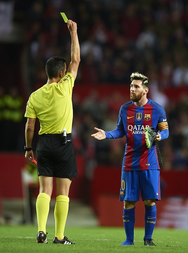 Аржентинската суперзвезда Лионел Меси отбеляза в неделя вечерта своя гол №500 за Барселона, поразявайки за 27-и път в кариерата си вратата на Севиля при победата на каталунците с 2:1 на "Рамон Санчес Писхуан". Меси бе точен в 43-ата минута, а в заключителните минути на двубоя "десетката" на "лос кулес" получи нелеп жълт картон. До него се стигна след пробив на Меси, при който той бе фаулиран от Стеван Нзонзи и падна на тревата, а една от обувките му се изхлузи. Реферът Хайме Латре обаче прецени, че Меси бави играта и го предупреди официално. Със сигурност това е най-странният жълт картон в кариерата на аржентинеца, а дали е заслужен или не, преценете сами.