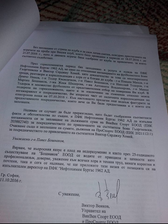 От няколко седмици обаче футболният мениджър Виктор Венков изпраща ултимативни писма до ръководството на Нефтохимик. Той твърди, че е в правото си и държи да си получи парите. От клуба са категорични, че контрактите на играчите са сключени преди договорите за посредничество и поради тази причина са безпредметни. Според тях не е имало основание за сключване на договорите и е липсвала практическа нужда от това, поради факта, че вече са били на лице сключени договори със въпростните състезатели.
