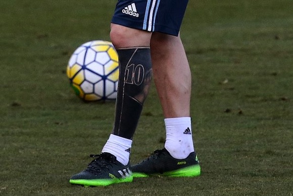 Лионел Меси пак впечатли по време не тренировка, но този път не с изявите си. Оказа се, че нападателят на Барселона се е сдобил с нова татуировка на левия крак в областта под коляното. По време на заниманието му с националния тим на Аржентина се видя, че рисунките по крайника на Лео вече са по-различни. Татуировка изглежда като чорап, но все пак се забелязва символът "10".