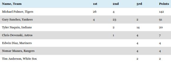 Същевременно за "Новобранец на годината" в Американската лига бе провъзгласен питчерът на Детройт Тайгърс Майкъл Фулмър. 23-годишният десничар получи 142 т. и остави далеч зад себе си кетчера на Ню Йорк Янкис Гари Санчес (91 т.) и централния аутфилдер на Кливланд Индиънс Тайлър Накуин (20 т.).