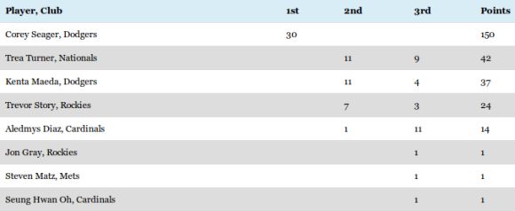 Шортстопът на Лос Анджелис Доджърс Кори Сийгър бе единодушно избран за "Новобранец на годината" в Националната лига на МЛБ. 22-годишният талант бе посочен на първо място във всички 30 анкетни карти на асоциацията на бейзболните журналисти в Северна Америка (BBWAA) и събра максимално възможните 150 т., разпределяни по системата 5-3-1 до трета позиция. В Топ 3 за 2016 г. влязоха още централният аутфилдер на Вашингтон Нешънълс Трей Търнър с 42 т. и питчерът съотборник на победителя Кента Маеда с 37 т.