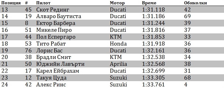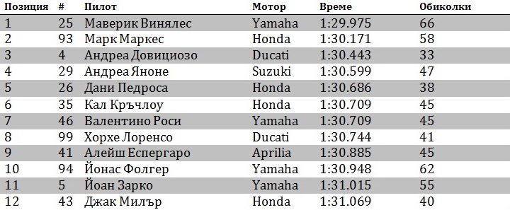 В по-голямата част от сесията днес лидер бе световният шампион в MotoGP Марк Маркес, за разлика от вчера. Винялес обаче успа да подобри времето му в последните два часа, а след като го направи, температурите започнаха да падат и бе невъзможно да се стигне до подобрения.