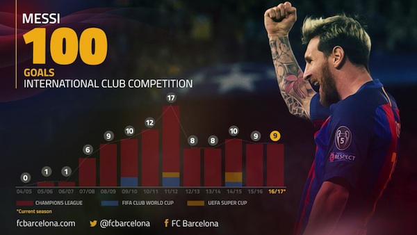 Меси е реализирал тези 100 попадения в общо 118 срещи. Аржентинецът има 92 гола в Шампионската лига (110 мача), 3 гола за Суперкупата на Европа (4 мача) и 5 гола на световни клубни първенства (5 мача), отбелязва официалният сайт на испанския гранд.