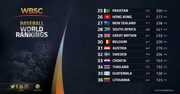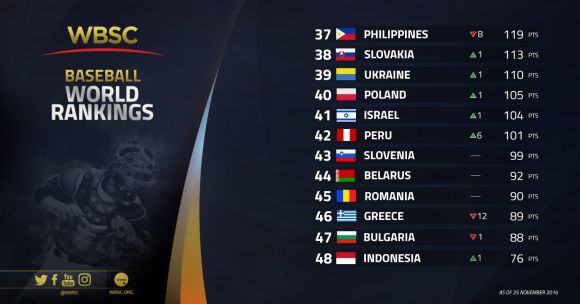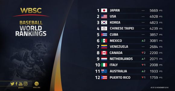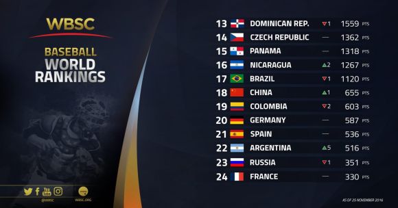 Подреждането на WBSC се изготвя въз основа на резултатите на всички национални отбори на съответната държава в турнирите на мъжко, младежко, юношеско и детско ниво под егидата на световната и континенталните федерации. Промени в челото няма – лидер е Япония с 5669 т., пред САЩ (4928 т.), Корея (4823 т.), Тайван (4239 т.) и Куба (3857 т.). За първи път от елитния Топ 12 изпада Доминиканската република – с 1559 т. шампионът от Световната класика '13 вече е на 13-о място.