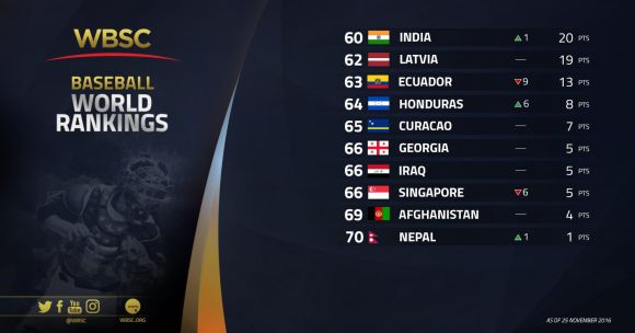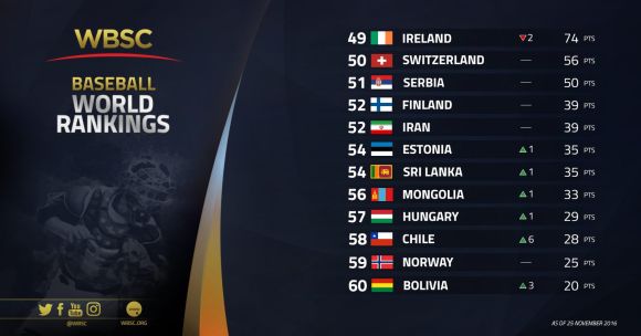 Световната бейзболна и софтболна конфедерация (WBSC) публикува последната за 2016 г. ранглиста на бейзбола. България ще завърши годината на 47-о място сред общо 70 страни, включени в класацията на националните федерации. Страната ни запазва актива си от 88 т., който не се е променял от миналото лято, но бележи леко отстъпление – с две места по-ниско спрямо финалната си позиция за 2015 г. и с едно надолу в сравнение с актуализираната версия през август.