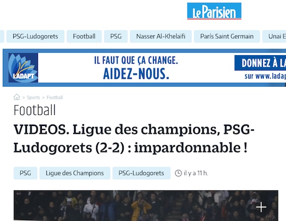 Равенството между Пари Сен Жермен и Лудогорец (2:2) в Шампионската лига не беше прието добре от медиите във Франция. Вестник Le Parisien е доста краен в коментара си: "Непростимо! Това е фиаско".