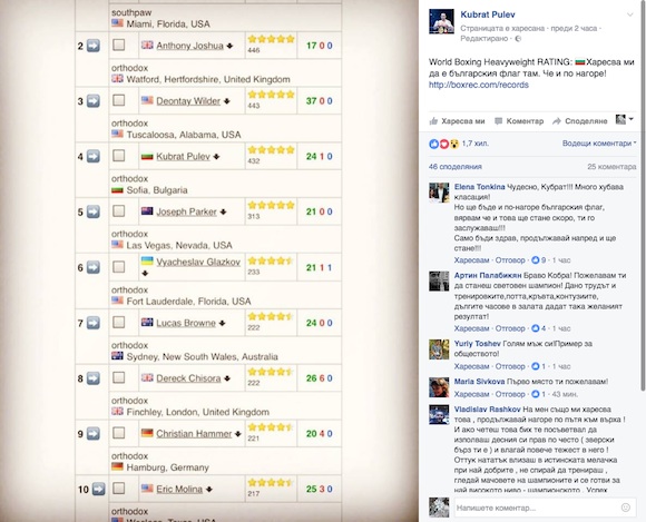 Въпреки това Пулев публикува снимка с ранкинга във "Фейсбук" и написа: "Харесва ми да е българският флаг там. Че и по-нагоре!" Публикацията му предизвика много реакции от страна на феновете, които го поздравяват и окуражават да продължава напред и нагоре.