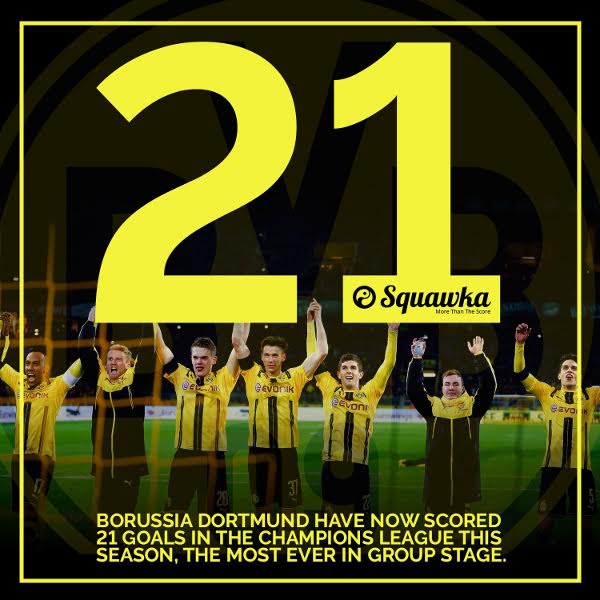 Паметна бе вечерта и за Борусия (Дортмунд). "Жълто-черните" на Томас Тухел не просто спечелиха групата си, но и установиха интересен и престижен рекорд. Германците станаха най-резултатният отбор в груповата фаза на Шампионската лига в рамките на един сезон в историята на турнира. Дортмундци вкараха общо 21 гола в шестте си срещи в своята група този сезон.