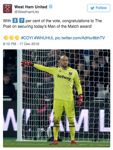Избраха гредата за най-добър играч в мача Уест Хам - Хъл Сити
