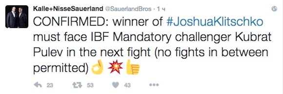 "ПОТВЪРДЕНО: Победителят от двубоя Антъни Джошуа – Владимир Кличко трябва да се изправи срещу задължителния претендент на IBF Кубрат Пулев в следващия мач", обявиха братята Кале и Нисе Зауерланд, промоутъри на българската звезда в супертежка категория на професионалния бокс. Те използваха своя общ профил в социалната мрежа "Туитър", за да съобщят това.