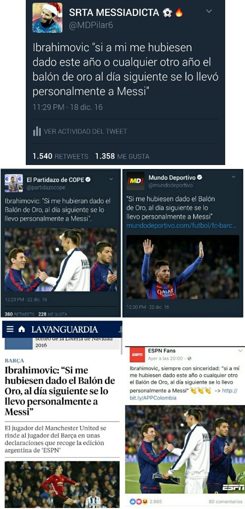 Цитатът на Златан Ибрахимович за Лионел Меси, който се появи вчера в медиите, се оказа фалшив. Вчера шведският нападател на Манчестър Юнайтед, бивш съотборник на аржентинеца в Барселона, бе цитиран да казва следното: "Ако ми бяха дали "Златната топка" тази година или която и да е година, още на следващия ден я връчвам на Меси".