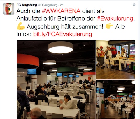 Футболен клуб Аугсбург отвори вратите на стадиона си за нуждаещите се във връзка с обявената спешна евакуация на около 54 000 души, които живеят в едноименния град в Южна Германия. Преди три дни там беше открита невзривена бомба от Втората световна война. Тя тежи 1,8 тона и предстои да бъде обезвредена. В тази връзка днес властите започнаха да извозват всички, които се намират в радиус от 1,5 км.
