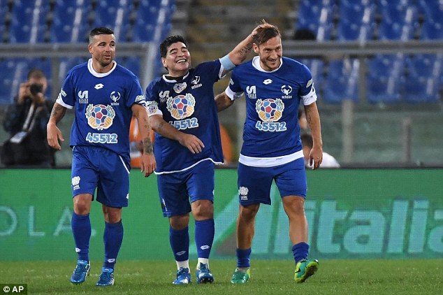 Двамата се срещнаха през октомври в Рим, където Марадона взе участие в благотворителен мач на "Олимпико". Тоти и Роналдиньо също бяха част от звездите, които играха в двубоя под наслов "Обединени за мир". Капитанът на "вълците" дори асистира на Марадона.