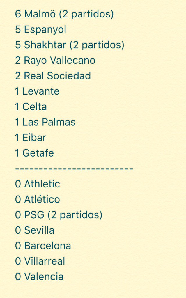 Към "сухите" му по-сериозни мачове трябва да прибавим и двете срещи с Пари Сен Жермен в Шампионската лига. Головете от началото на сезона са разпределени по следния начин: 6 на Малмьо (2 мача), 5 на Еспаньол, 5 на Шахтьор (Донецк) (2 мача), 2 на Райо Валекано, 2 на Реал Сосиедад, 1 на Леванте, 1 на Селта, 1 на Лас Палмас, 1 на Ейбар и 1 на Хетафе.
