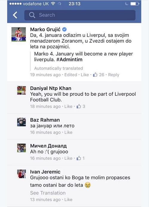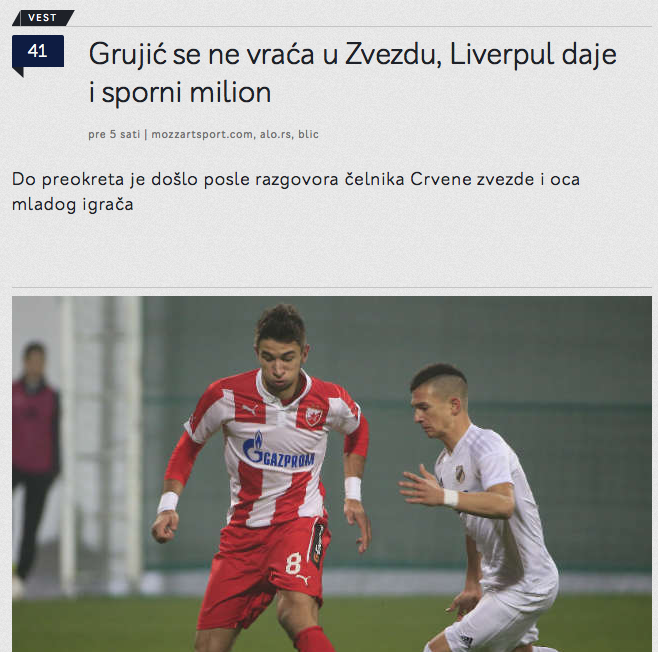 "Вярно е. От 4 януари ще съм футболист на Ливърпул. След като подпиша договора си, ще се върна в Звезда", написа в официалния си профил във "Фейсбук" Марко Груич.
