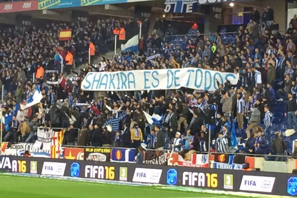 Феновете на Еспаньол опънаха транспарант "Шакира е обща", с който искаха да подразнят защитника на Барса Жерар Пике, който е съпруг на колумбийската музикална звезда.