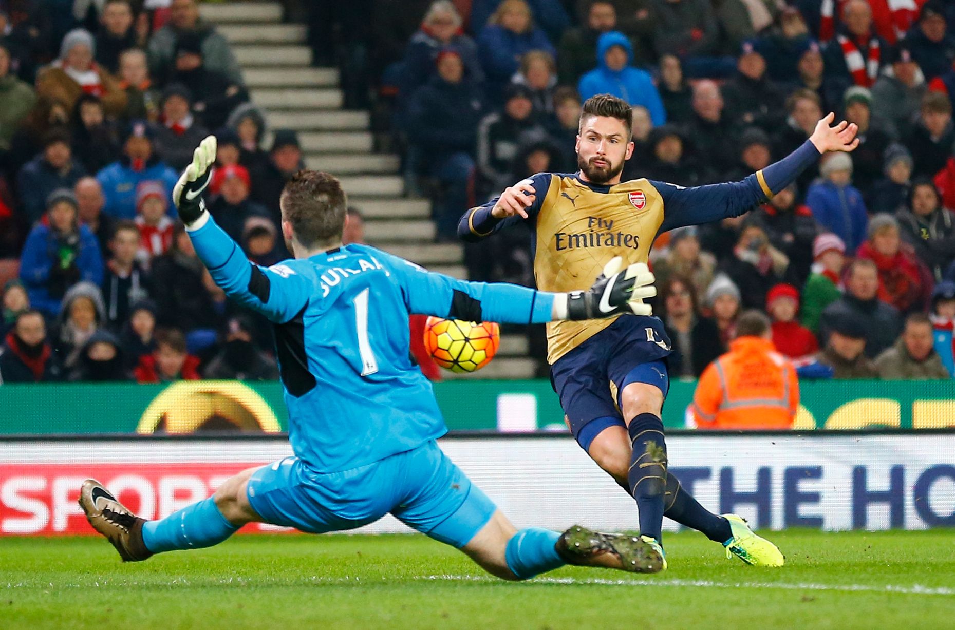 асистент №1 във Висшата лига този сезон Месут Йозил преди началото на мача се оказа много голям удар за гостите, които пострадаха много от неговото отсъствие. Алекс Окслейд-Чембърлейн пробва късмета си от далечно разстояние преди почивката, но Бътланд отново бе на мястото си.