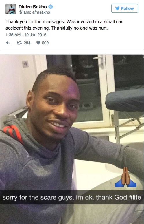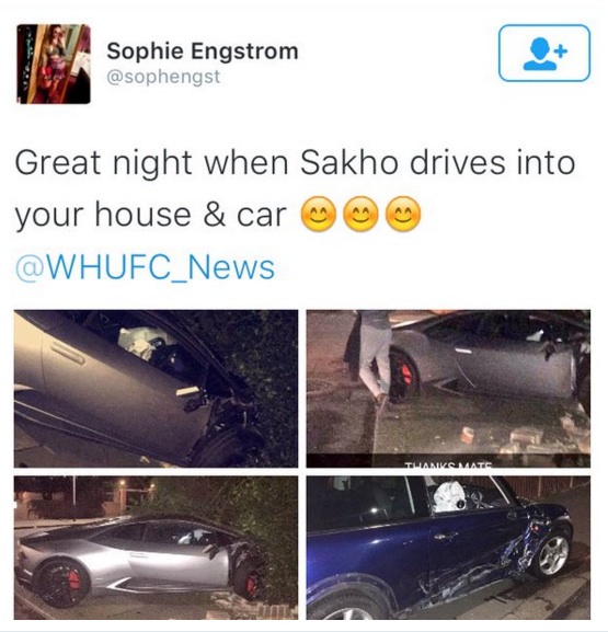 Нападателят на Уест Хам Диафра Сако е катастрофирал със своето Lamborghini миналата нощ. Сенегалецът е добре и няма никакви наранявания, както няма и други пострадали при инцидента. Футболистът е загубил управлението на автомобила, след което се блъснал в стена и в друга кола. Първите снимки в интернет се появиха само минути по-късно, тъй като се оказа, че въпросната стена е част от къща на привърженичка на Уест Хам.
