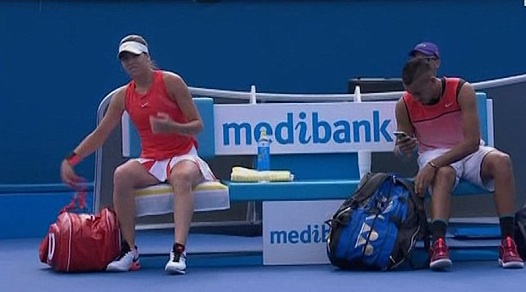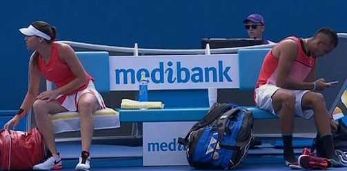 За пореден път Ник Кирьос попадна в полезрението на медиите, но не с победа на корта, а с изцепка. 20-годишният тенисист отпадна от надпреварата на сингъл на Откритото първенство на Австралия, а в двубоя си от първия кръг в турнира при смесените двойки отново се изяви. Кирьос демонстративно вдигна телефона си непосредствено преди началото на мача с парньорката и спряганата за негово гадже Айла Томлянович. Все пак той и хърватката загубиха срещата с 5:7, 1:6 срещу лидерите в схемата Саня Мирза и Иван Додиг.