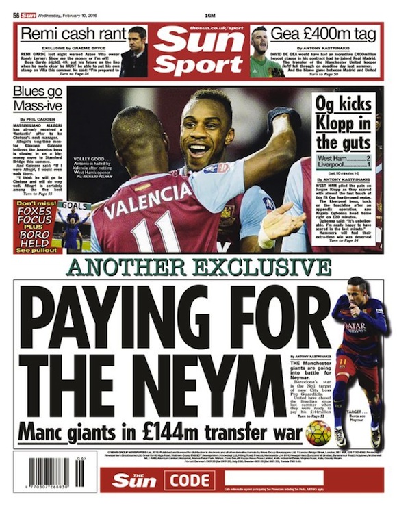 Градските съперници Манчестър Юнайтед и Манчестър Сити започват война за Неймар, след като и двата клуба са готови да платят откупната му клауза в размер на 190 млн. евро, твърди таблоидът Sun във водещия материал на днешния си брой. Нападателят на Барселона е обект на огромен интерес, като се говори, че от Реал Мадрид вече на няколко пъти са се опитвали да го привлекат.