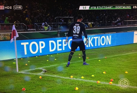 Около 400 привърженици на гостите от Дортмунд влязоха в своя сектор едва в 20-ата минута, а малко след това започнаха да хвърлят на терена топки за тенис. По такъв начин те изразиха несъгласието си с цените на билетите за двубоя. За най-евтините билети за правостоящи за този мач, феновете на Борусия трябваше да извадят по 19,5 евро, а най-евтините пропуски за седящи места им струваха по 38,5 евро.