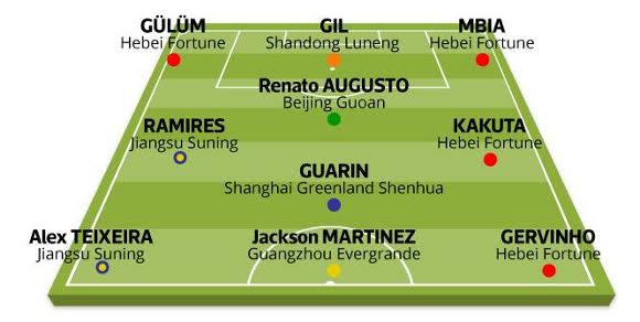 Халфове: Ренато Аугусто (Пекин Гуоан), Рамиреш (Жиангсу Сунинг), Какута (Хебей Форчън), Гуарин (Шанхай Грийнланд Шенхуа)