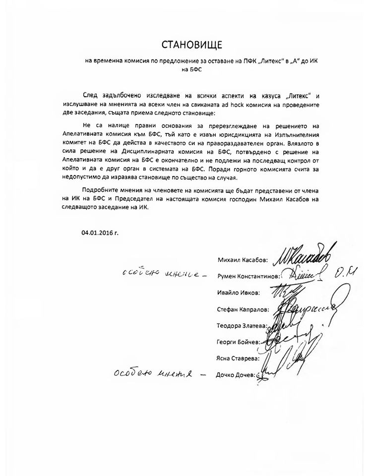 На страницата на специалиста по спортно право Георги Градев се появи становището на временната комисия по предложение за оставане на Литекс в "А" група до Изпълкома на БФС.
