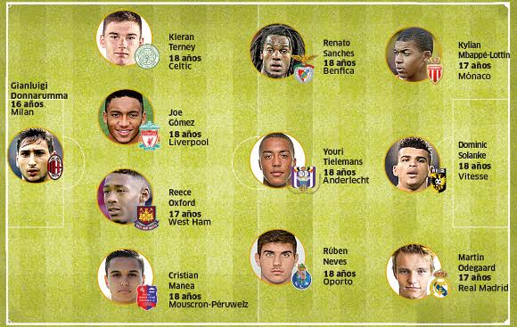 Испанското спортно издание "Марка" предложи на читателите си своята идеална единадесеторка на футболните таланти в Европа до 18 години. На вратата испанските колеги са поставили стража на Милан Джанлуиджи Донарума, а в идеалния отбор са намерили място още норвежкият нападател на Реал Мадрид Мартин Йодегор и свързваният от медиите с Манчестър Юнайтед халф на Бенфика Ренато Санчес. Тук е и талантът на Монако Килиан Мбапе Лотен, който наскоро счупи рекорд на Тиери Анри. Мбапе Лотен отбеляза първия си гол за монегаските на 17 години и 2 месеца, подобрявайки постижението Анри, който реализира дебютното си попадение за тима на възраст 17 години и 8 месеца.