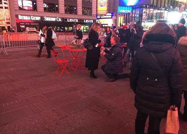 43-годишният Роджърс коленичи насред "Таймс Скуеър" в Ню Йорк и събра погледите на случайни минувачи с предложението си към десет години по-младата си приятелка. Той използва разходката на двамата на едно от най-известните места в света, за да направи предложението си за брак.