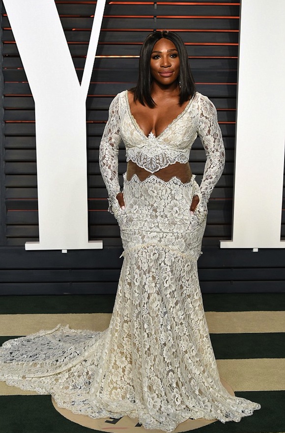 Ракета №1 в женския тенис Серина Уилямс заложи на булчинския шик за партито на Vanity Fair след връчването на наградите "Оскар". 34-годишната спортна икона се появи на събитието с елегантна рокля от бяла дантела и дълъг шлейф.
