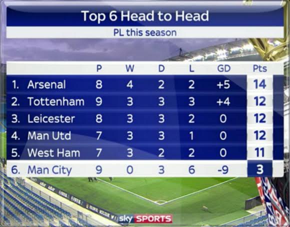 И докато все още играчите на напускащия след края на сезона Мануел Пелегрини се държат за четвъртото място в Премиър лийг, то в едно друго класиране те са отчайващо последни. Sky Sports показа интересна статистика за преките двубои между първите шест отбора в подреждането. Най-много точки в тези срещи е събрал Арсенал - 14, докато с най-лоши (направо плачевни) показатели е Манчестър Сити. От 9 мача срещу най-добрите, "гражданите" нямат нито една победа и са взели жалките 3 точки - 3 равенства и 6 поражения, като головата им разлика е -9.