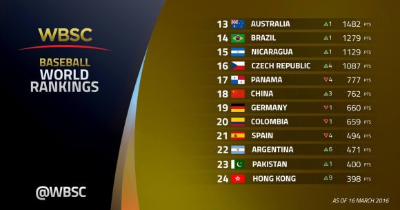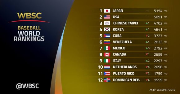 За първи път от създаването на световната ранглиста през 2009 г. от Топ 3 изпада Куба, а на трето място излиза Тайван, чийто отбор до 21 г. е световен шампион за младежи. Шампионът от първенството на планетата за мъже "Премиър 12" – Корея, пък се изкачва с четири места до №4 в света. А шампионът от Световната класика '13 – Доминиканската република, се смъква с шест позиции до №12 и запазва на косъм мястото си в елитната дузина.