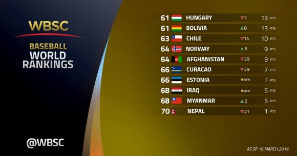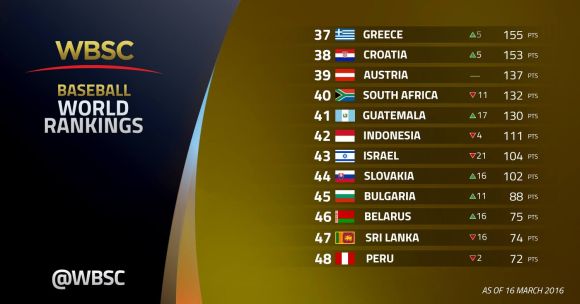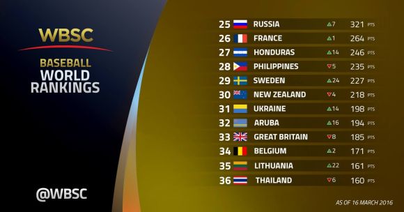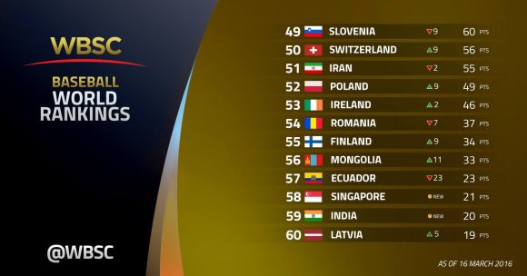 Едва за втори път в историята България влезе в Топ 50 на световната ранглиста по бейзбол. Дебютът на федерацията ни (БФБ) в първата петдесетица бе под №49 през 2011 г., когато класацията се съставяше от международната централа (IBAF). А в изготвеното от световната конфедерация (WBSC) подреждане за 2016 г. страната ни отбелязва нов рекорд – 45-о място.