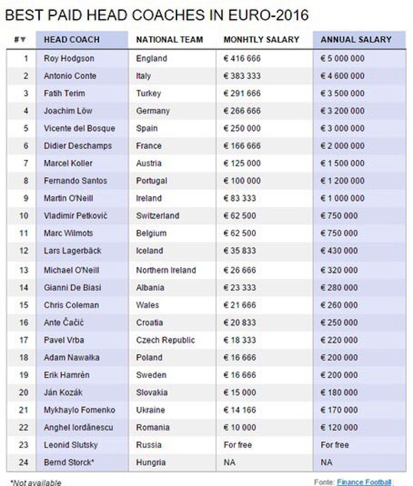 Селекционерът на Англия Рой Ходжсън взима най-висока заплата сред всичките си колеги от отборите, които ще участват на Евро 2016. Данните за възнагражденията на треньорите публикува Finance Foоtball.