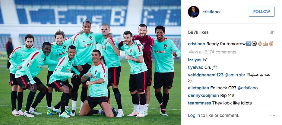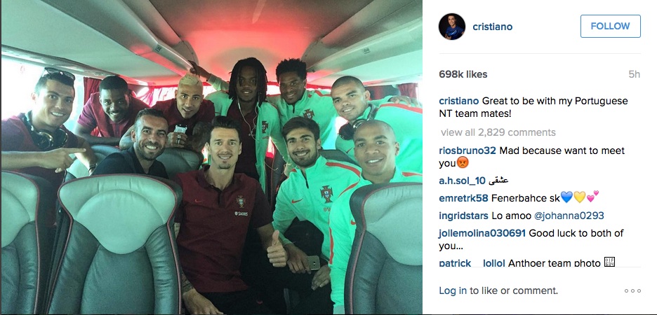 Португалската суперзвезда Кристиано Роналдо демонстрира отлично настроение преди срещата с България утре на на "Ещадио Д-р Магаляеш Песоа" в Лейрия. Голмайсторът на Реал Мадрид пусна в своя профил в Инстаграм две снимки с посланието "Готови сме за утре" след последната тренировка в Лисабон. CR7 позира с голяма усмивка с още девет свои колеги начело с Пепе и Нани. Преди това Кристиано пусна снимка от автобуса на тима в компанията на доста от своите съотборници: "Велико е да съм с португалските си съотборници", написа голямата звезда на португалците.