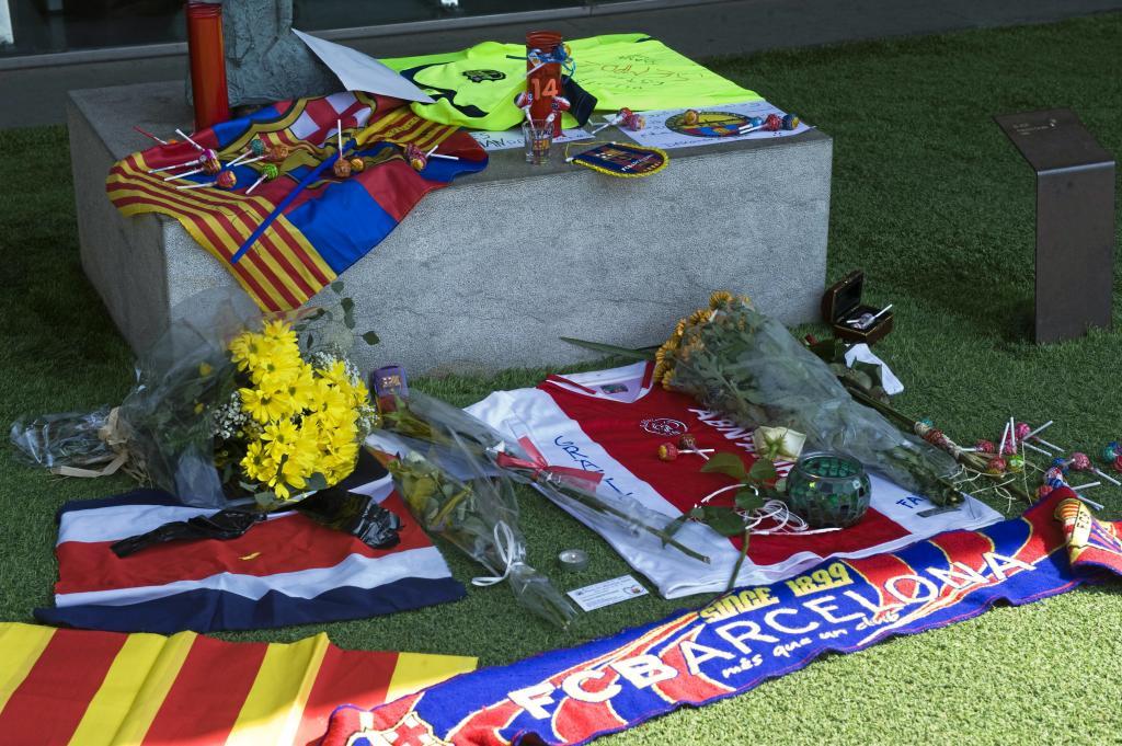 Днес спонтанно голям брой запалянковци дойдоха до врата номер 14 на "Камп Ноу", за да поднесат цветя и близалки в памет на величието.